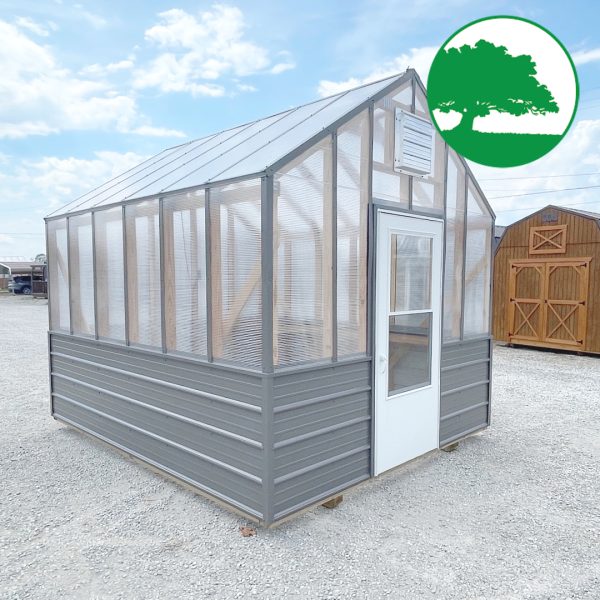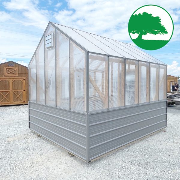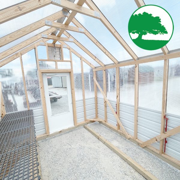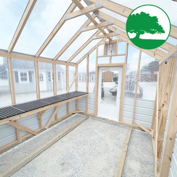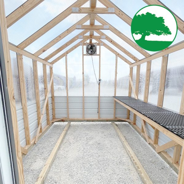 Features: Storm Door Upgrade (White), 8 mm Twin-Wall Polycarbonate, Worry Free Thermostat Controlled Exhaust Fan / Electric, Heat Activated Intake Vent, 2′ Plastic Gardening Bench, (2) Ground Anchors Included