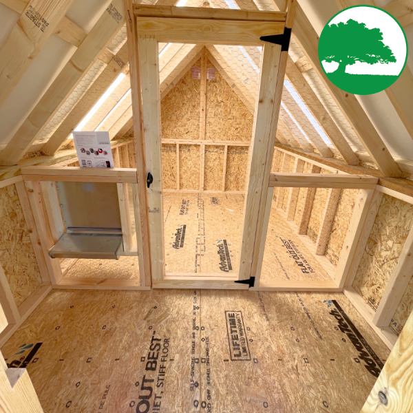 Features: Divided Coop / Feed Room Layout, Metal Angled Nesting Box w/ Feed Room Access, Entry Door w/ Keyed Entry, Automatic Solar Chicken Door, Roosting Bar, Lighted Roof Panels, LP SmartSiding (50 Year Warranty)
