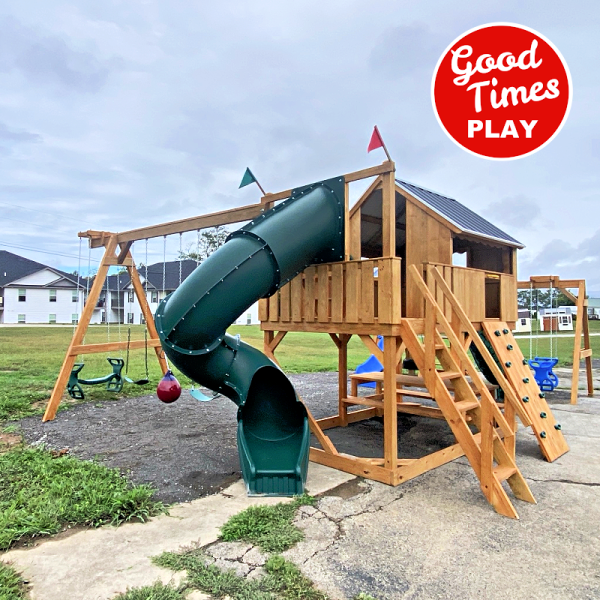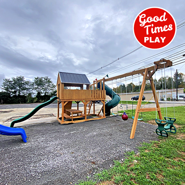 beams / accessories: tall swing pole, 4 position swing beam with (2) belt swings, buoy ball & ez ryder (2-kid swing)