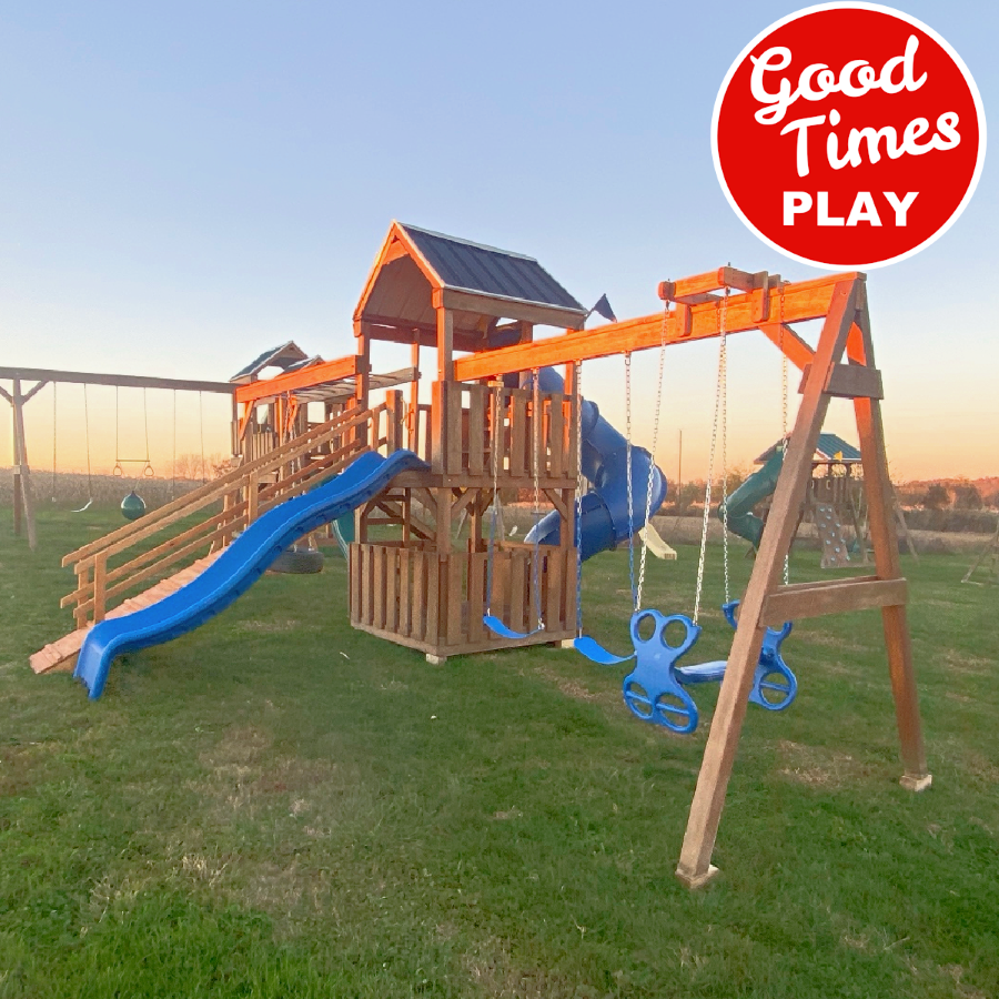 beams / accessories: 3 position swing beam with (2) belt swings & ez ryder (2-kid swing), separate monkey bar with tire swing