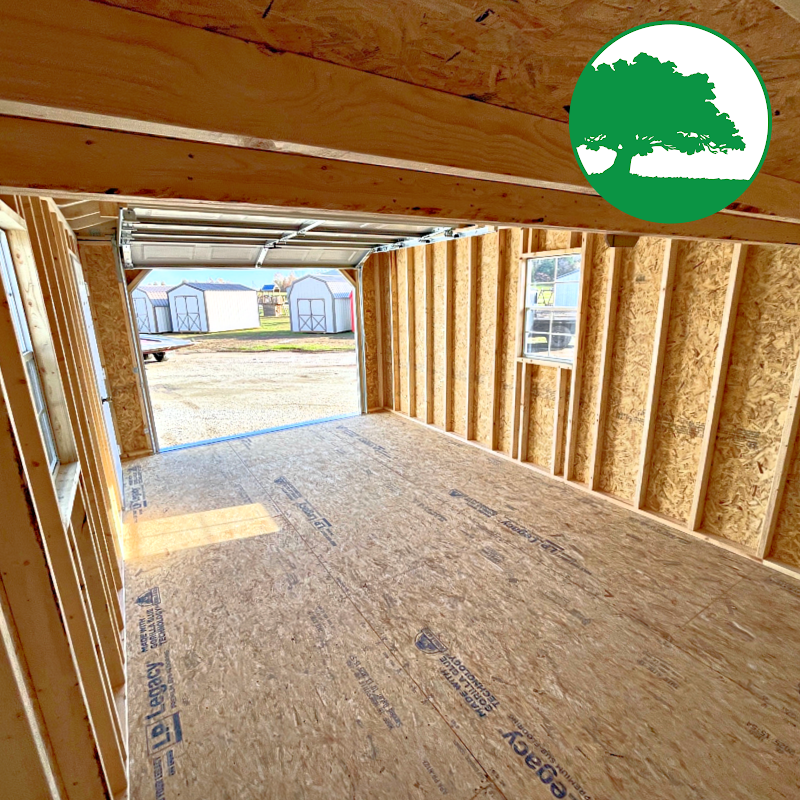 Features: 9′ x 7′ Overhead Door, 6 Panel / Solid Entry Door, (2) 2′ x 3′ Aluminum Windows w/ Shutters, 4′ x 12′ Overhead Loft, 2″ x 4″ Floor Joist (12″ o.c.), 8′ TALL Walls, LP SmartSide Siding (50 Year Warranty)