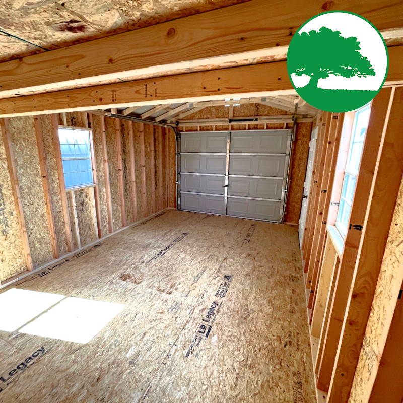 Features: 9′ x 7′ Overhead Door, 6 Panel / Solid Entry Door, (2) 2′ x 3′ Aluminum Windows w/ Shutters, 4′ x 12′ Overhead Loft, 2″ x 4″ Floor Joist (12″ o.c.), 8′ TALL Walls, LP SmartSide Siding (50 Year Warranty)