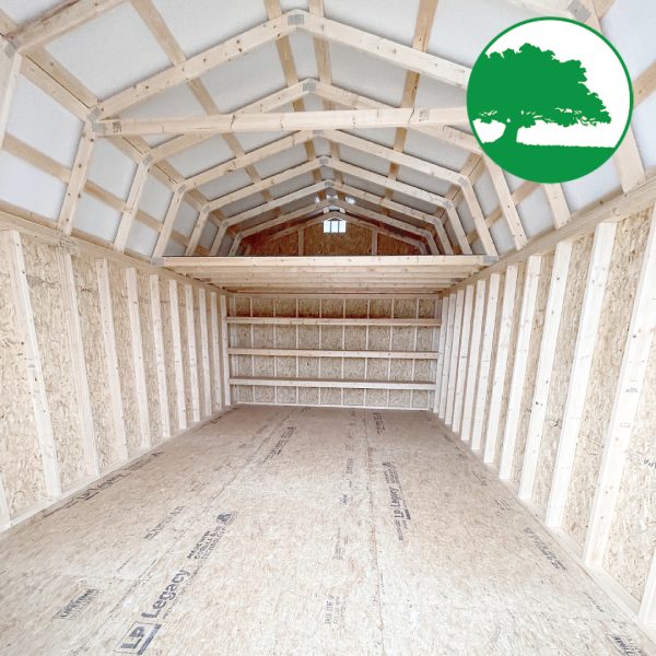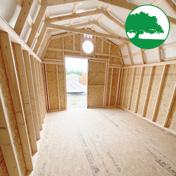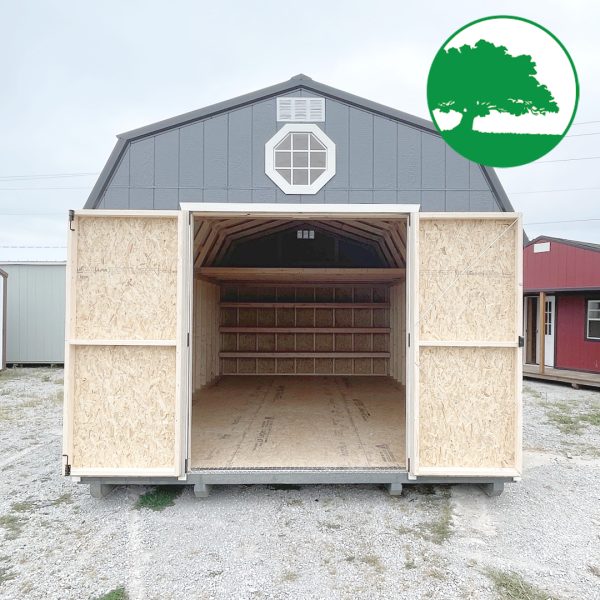 Features: Double Entry Doors, 18″ Octagon Window, 3-Tier OSB Shelving (16″ deep), 16″ o.c. Floor Joists, Overhead Loft, LP SmartSide Siding (50 Year Warranty)