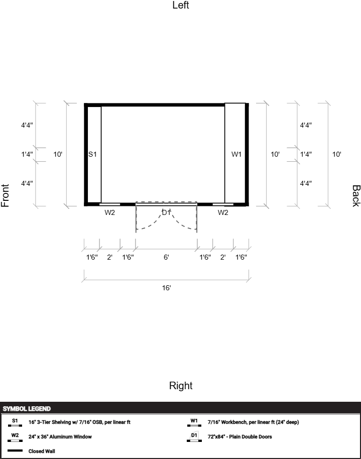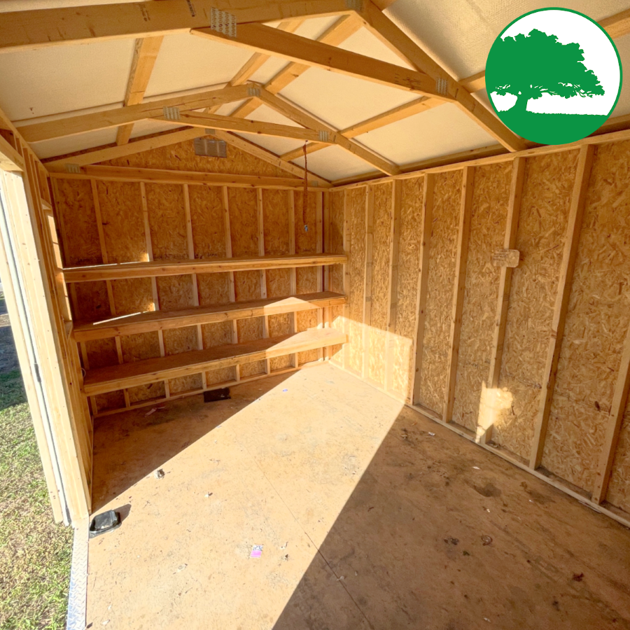 Features: Double Entry Doors, (2) 2′ x 3′ Aluminum Window, 8′ TALL Walls, 3-Tier OSB Shelving (16″ Deep), Plywood Workbench (24″ Deep), LP SmartSide Siding (50 Year Warranty)
