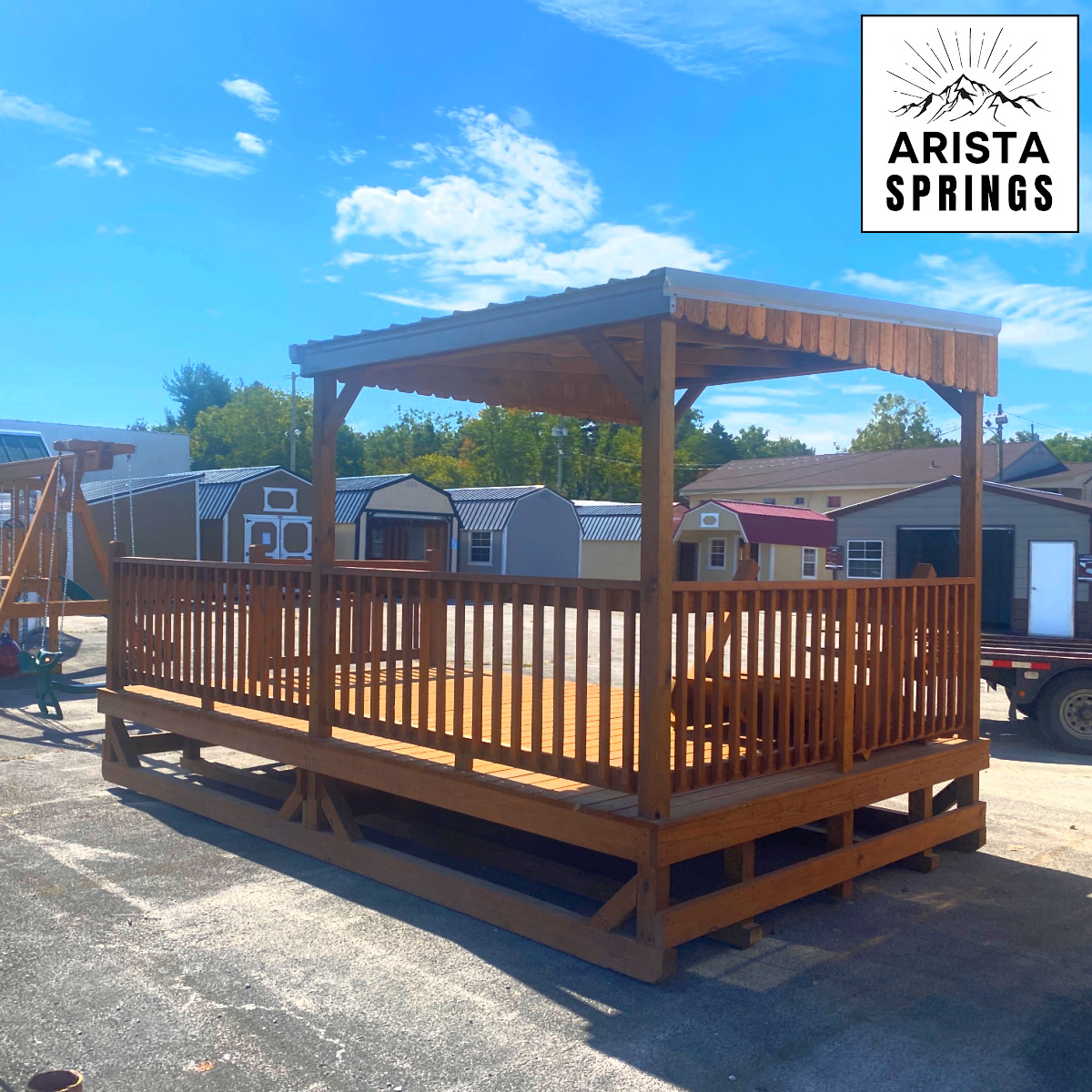 Features: 4′ x 4′ Posts, 5/4″ x 6″ Decking, 4″ x 6″ Pressure Treated Runners, 29 Gauge Metal Roof, Approx 3′ Single opening w/ steps (Steps are built to code w/ (2) handrails), Free Delivery with Blocks