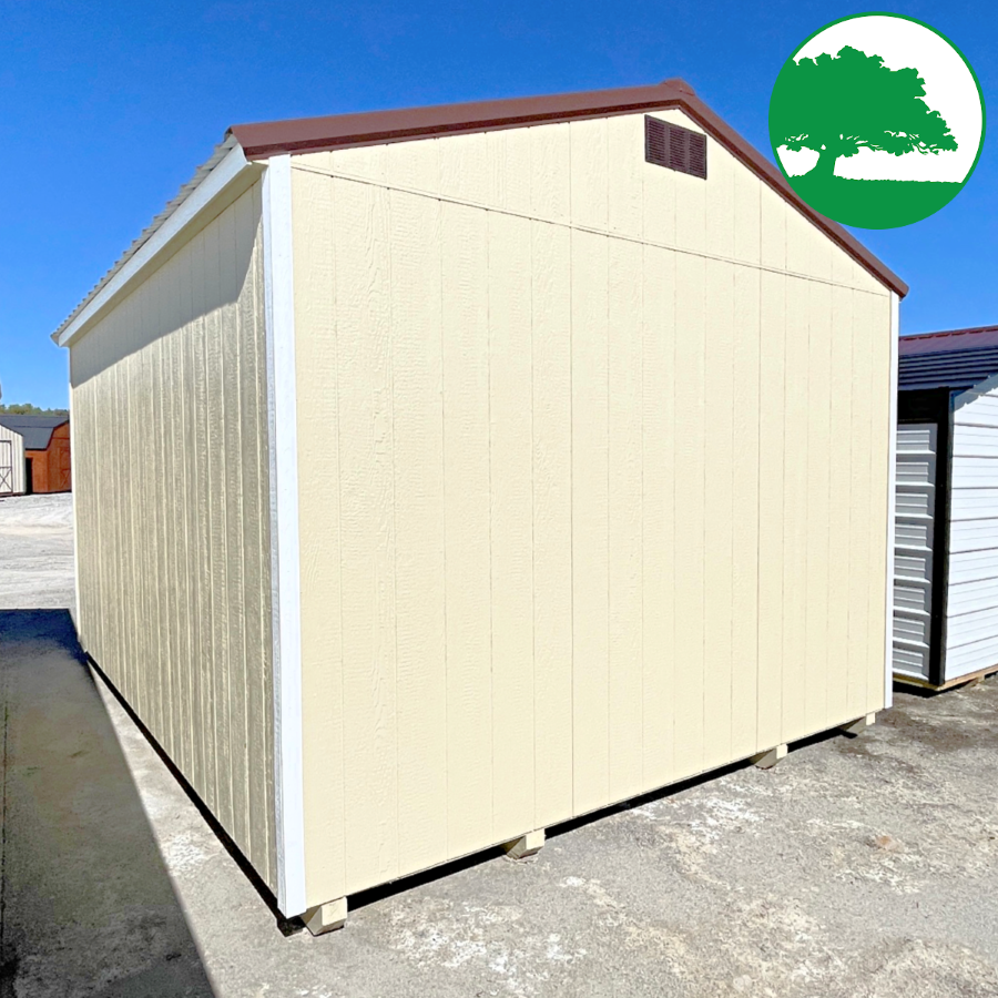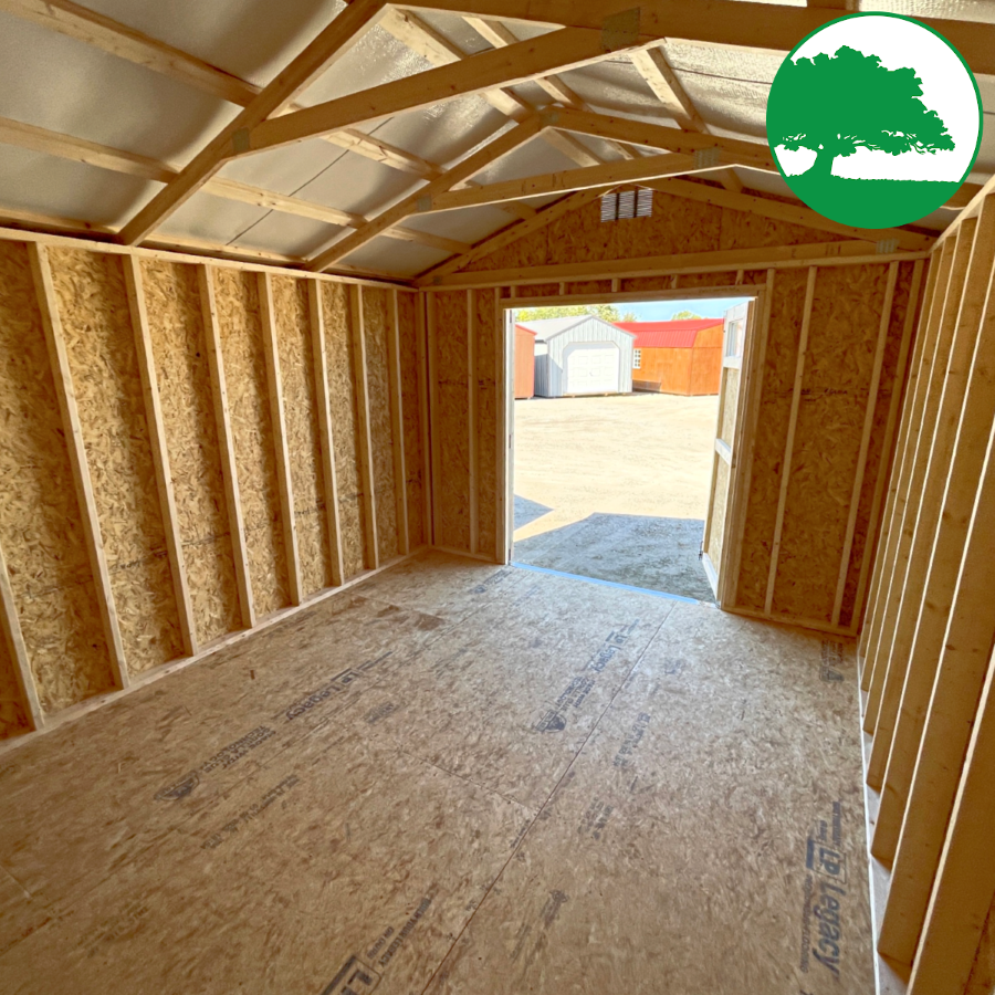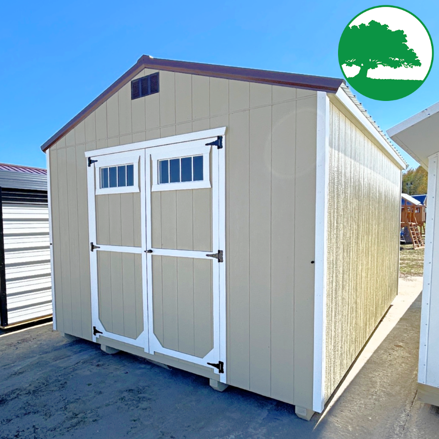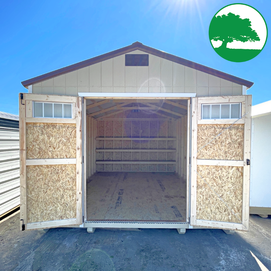 Features: Double Entry Doors w/ Transom Windows, 8′ TALL Walls, 3-Tier OSB Shelving (16″ deep), LP SmartSide Siding (50 Year Warranty)